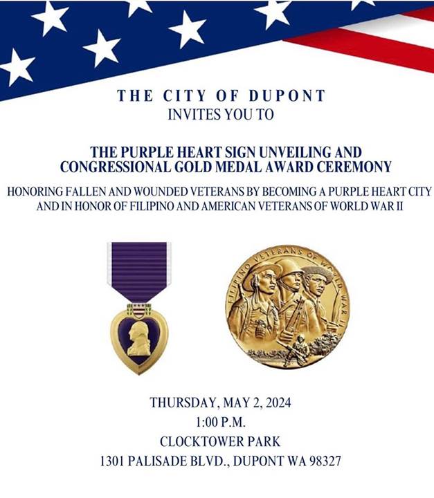 On May 2, 2024 a couple of our PS Patriot members had the privilege of attending a Purple Heart Sign Unveiling and Congressional Gold Medal Awards ceremony in Clocktower Park, Dupont Washington. The ceremony honored World War II Combat Veterans including 101 year old Harvey J. Dahos who also kindly gave some military public affairs personnel from JBLM an interview.